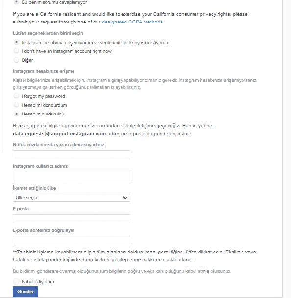 • Instagram hesabıma erişemiyorum ve verilerimin bir kopyasını istiyorum
