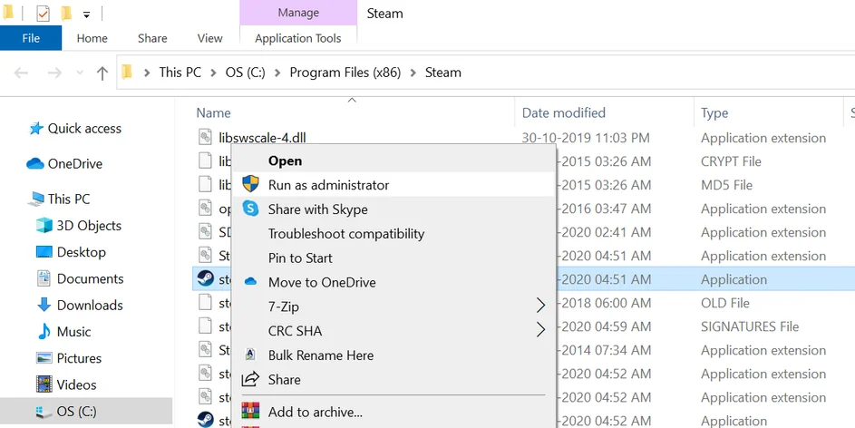 - Bul Steam.exe dosyalar listesinde, bu dosyayı sağ tıklatın ve seçin yönetici olarak çalıştır.
