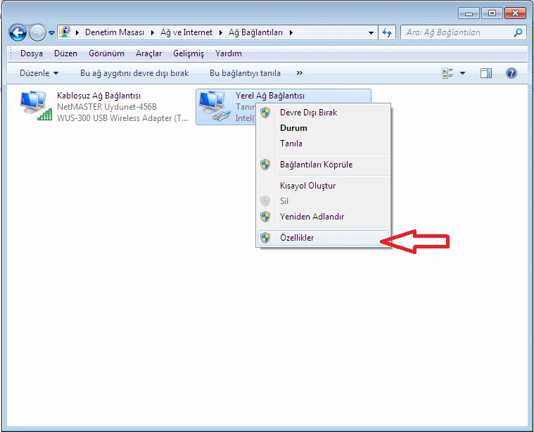Açılan pencerede yerel ağ bağlantısı‘na sağ tuş tıklayarak özellikler’i tıklayalım.