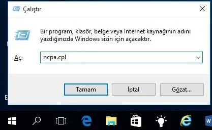 Klavyenizde bulunan Windows tuşu ile R tuşuna aynı anda basın; karşınıza çalıştır ekranı gelecek. Bu pencere ‘’ncpa.cpl’’ yazarak tamam tıklayalım.