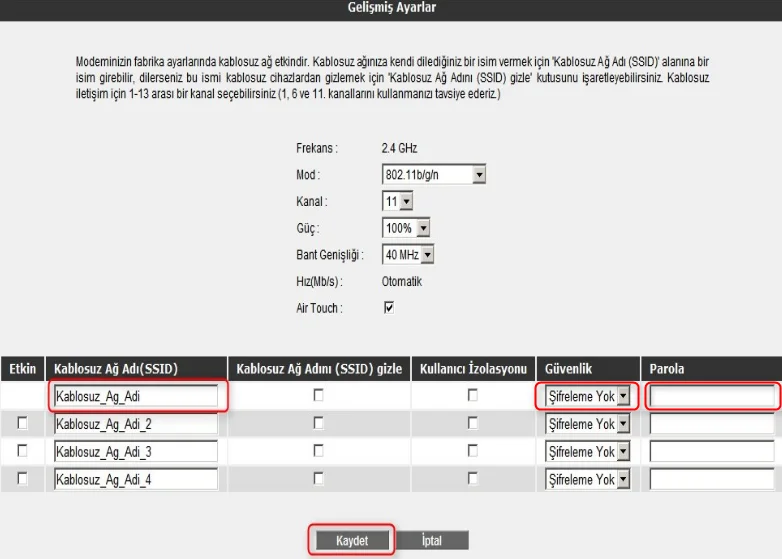 Açılan ekranda ilk satıra Türkçe karakter kullanmadan kablosuz ağ adınızı ve en az 8 karakter olmak üzere şifrenizi yazarak kaydet diyelim.