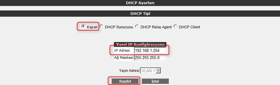 NOT: Ana modem IP’si farklı blokta ise; örnek 1 blokta olduğu için bu kısımda DHCP kapalı seçerek IP bloğunu değiştirdim… Fakat değişiklik yaptığınız IP, Airties 4450 AP’ye bağlanacağınız IP olacaktır.