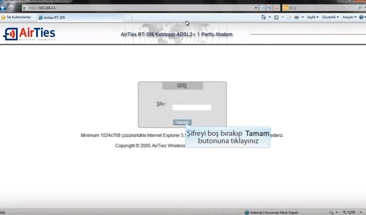 Karşınıza AirTies RT-205 Modem’in web arayüzü gelecektir. Cihazın fabrika ayarlarında, şifre tanımlı olmadığı için Şifre alanını boş bırakarak “Tamam” butonuna basınız.