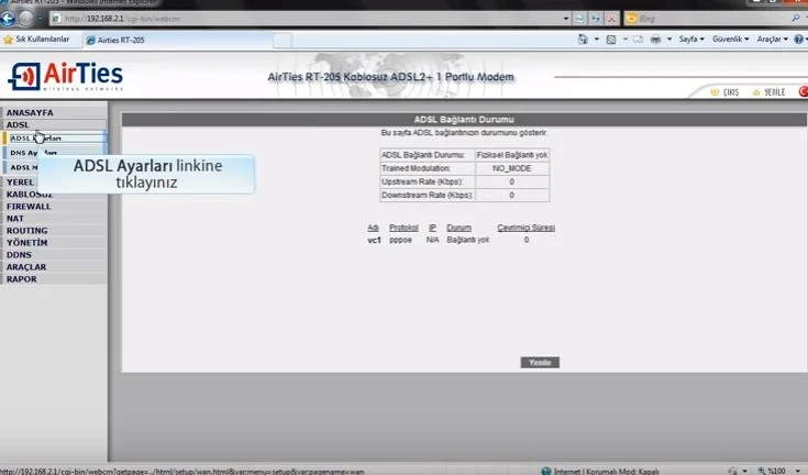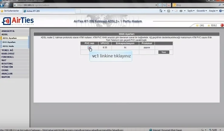 Karşınıza gelen ekranın üst tarafında bulunan ana menülerden ADSL menüsüne ve altındaki “ADSL Ayarları”na tıklayınız. Açılan pencerede vc1 linki üzerine tıklayınız.