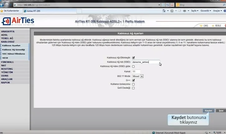 Kablosuz ağ ayarları ekranında modeminizin kablosuz ağ adını oluşturduktan sonra “Kaydet” butonuna basalım.
