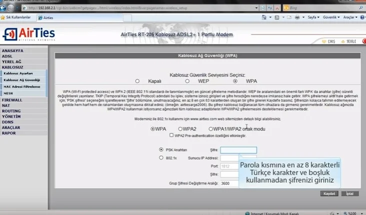 Ayarlarınızı Resimdeki gibi gerçekleştirdikten sonra “PSK Anahtarı” bölümüne Kablosuz ağ şifresini oluşturup “Kaydet” diyelim.