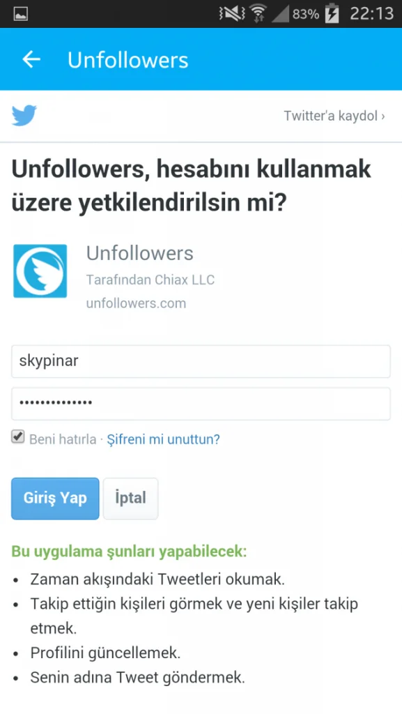 Uygulamayı telefonumuza indirdikten sonra açalım. Karşımıza; “Twitter ile oturum aç” ve “Instagram ile oturum aç” diye 2 seçenek geliyor. Burdan “Twitter ile oturum aç”ı seçelim ve hesap bilgilerimizi girerek oturum açalım.