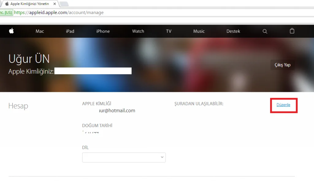 Bu tuşlamanın ardından sistem bizi http://appleid.apple.com’a yönlendirecektir. Bu sitede de öncelikle Apple Kimliği‘mizle hesabımıza giriş yapıyoruz.