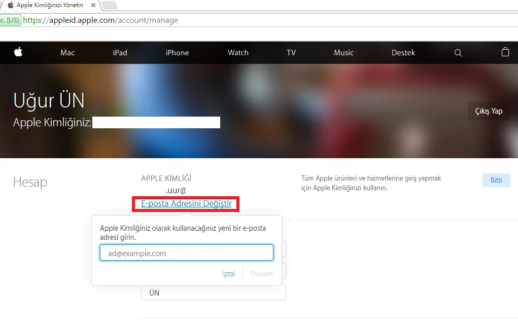 Daha sonra açılan ekranda bulunan Apple Kimliği‘nin altındaki Değiştir butonuna basıyoruz ve Apple Kimliği‘mize yeni bir e-posta adresi tanımlaması yapıyoruz ve Bitti butonuna basıyoruz. Bu işlemlerin ardından e-posta adreslerimize işlem değişikliği teyit e-postası gelecektir. Gelen e-posta’lar içerisinde bulunan onay linklerine de tıklayarak Apple Kimliği üzerinde kayıtlı bulunan e-posta adresini değiştirmiş oluyoruz.