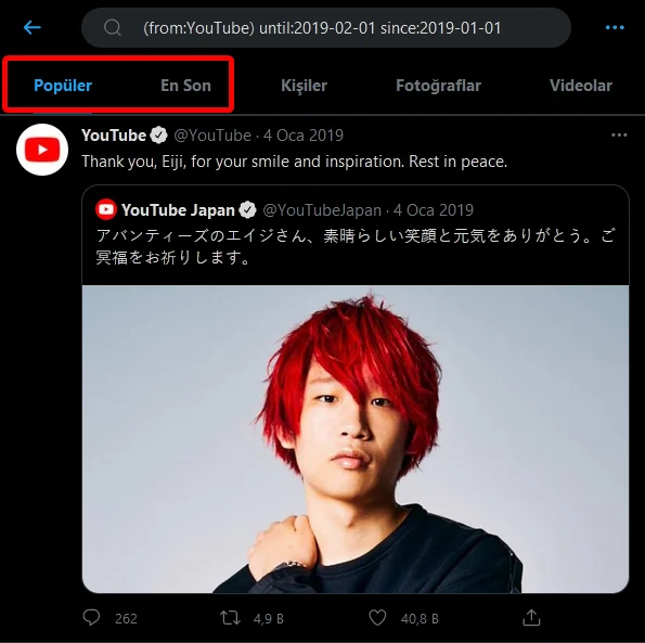 - From: Tweetlerini görmek istediğiniz hesabın kullanıcı adı (Örneğin: from:YouTube veya from:Twitter).
