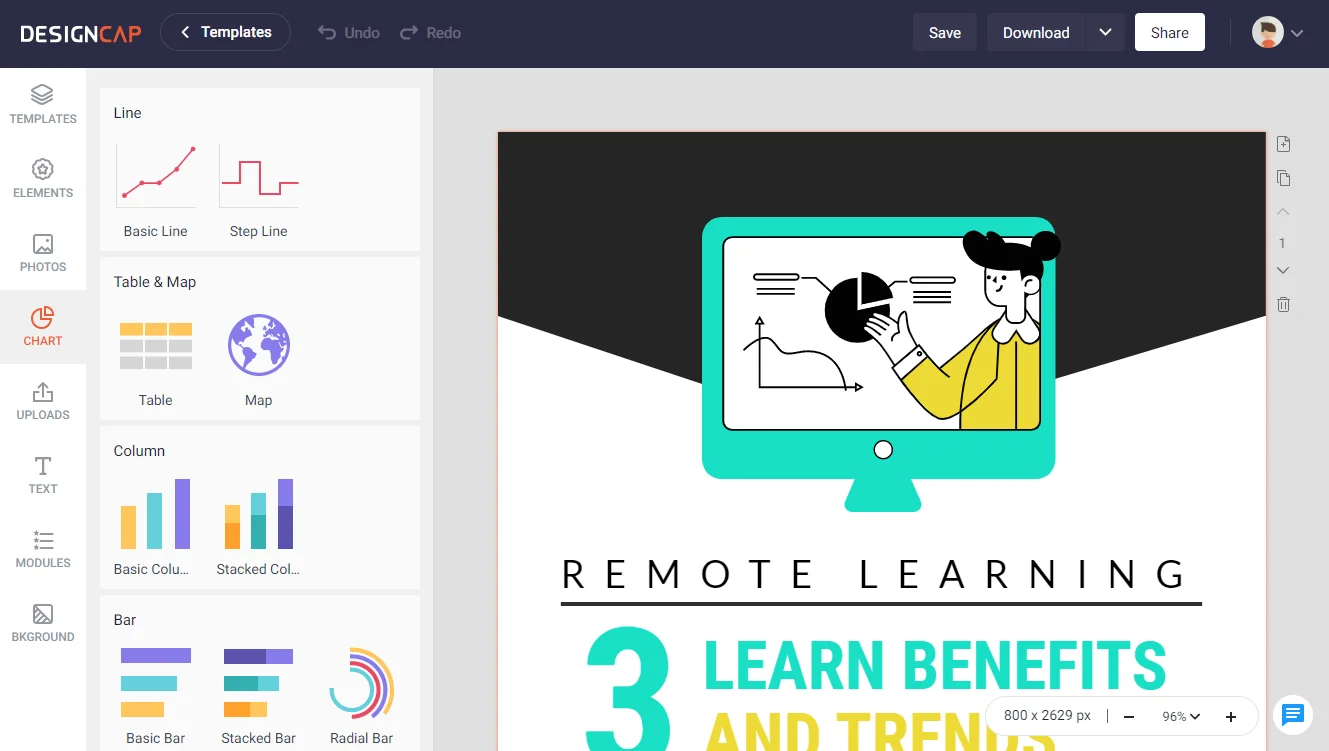 İnfografiğinizi düzenlemeyi bitirdiniz mi? Şimdi ekranın sağ üst köşesindeki indirme düğmesine tıklayın ve tasarımınızı kaydedin ve istediğiniz yerde kullanın. Dilediğiniz zaman sosyal medya gönderilerinizde veya web sitesi makalelerinizde kullanabilirsiniz. Bunu gördün mü? DesignCap hayatı kolaylaştırır ve dakikalar içinde harika görünen içerikler oluşturmanıza yardımcı olur.