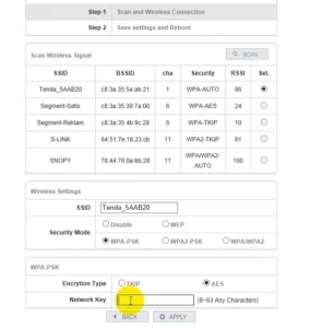 Ana modeminizin kablosuz ağ adını bulduysanız ekranda işaretleyelim ve ardından alt kısımda açılan bölüme kablosuz ağ şifrenizi yazalım ve APPLY bölümüne tıklayalım.