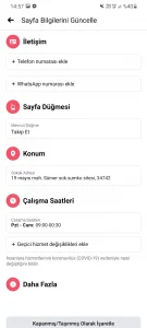 Gördüğünüz üzere bu kısımda da sayfamıza çeşitli fonksiyon düğmeleri , konum bilgileri , çalışma saatleri ekleyebiliyoruz. Ayrıca eğer işletmemiz kapandıysa tasfiye durumu varsa en altta bulunan kapanmış / taşınmış olarak işaretle seçeneğini seçebiliyoruz.