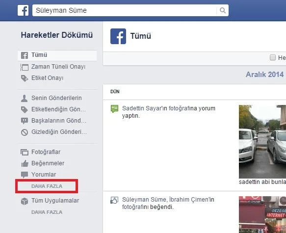 Facebook sayfamızda sağ üstteki Ok işaretine tıklayarak Hareketler Dökümüne tıklıyoruz. Eğer mobil uygulama üzerinden kullanıyorsanız bunu üç nokta işarete tıklayarak yapınız. Böylece aynı seçenekleri mobil uygulama üzerinden de görürsünüz.