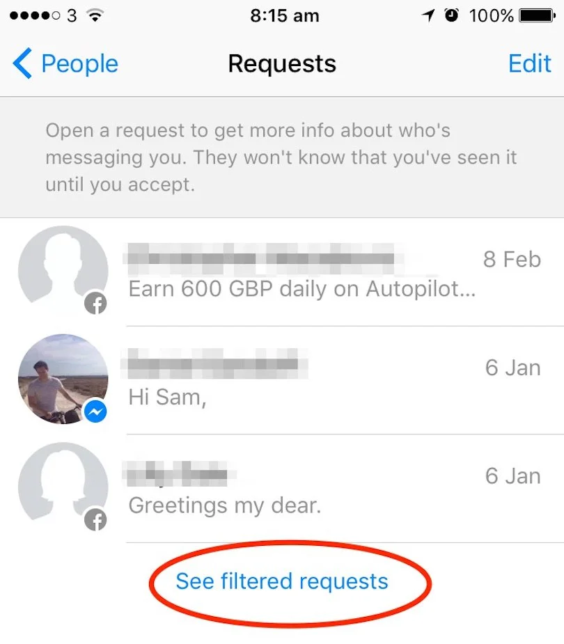 - Gelen ekranda, daha önce aldığınız mesaj isteklerinin hemen altında bulunan ‘Filtrelenen istekleri gör (See filtered requests)’ seçeneğini seçin.