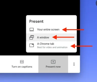 Google meet’i bir web tarayıcısından kullanırken tüm ekranınızı, belirli bir pencereyi veya belirli bir tarayıcı sekmesini paylaşabilirsiniz. Farklı seçeneğe geçmek için önce paylaşımı tamamen durdurmanız gerekir.
