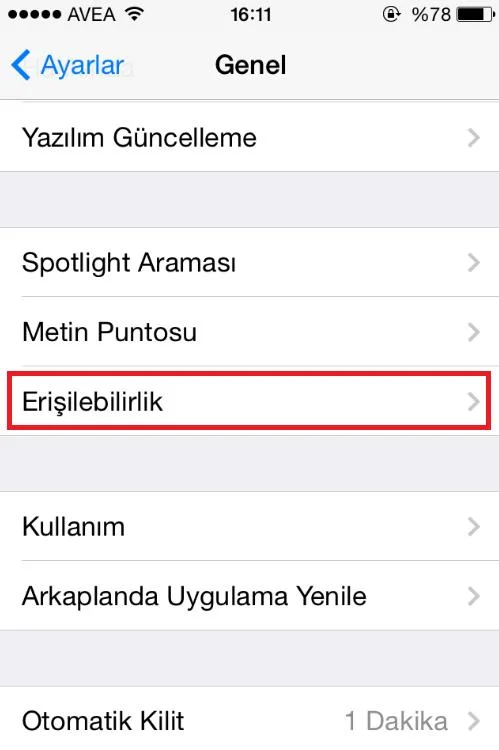 Daha sonra genel menüsünde bulunan “Erişilebilirlik” menüsüne giriyoruz.