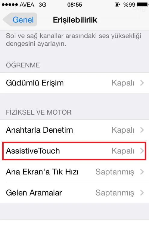Erişilebilirlik menüsünü ise aşağı doğru kaydırıyoruz ve “Assistive Touch” menüsüne giriyoruz.