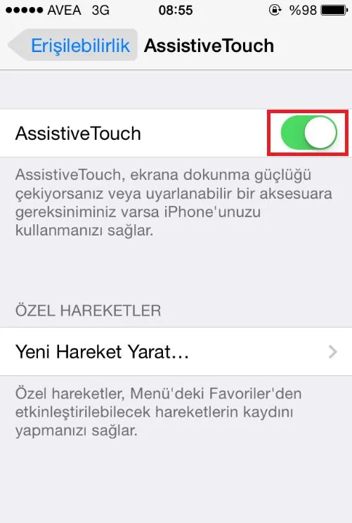 Assistive Touch menüsünde ise kapalı olan ayarı açık hale getiriyoruz.