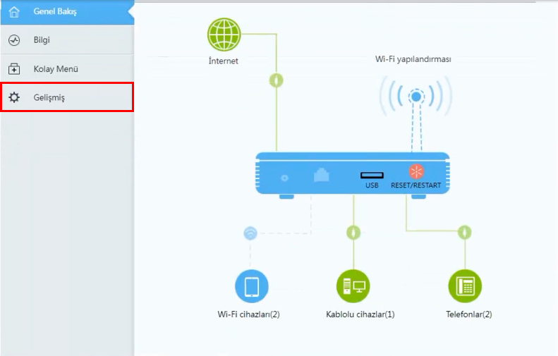 Huawei LG8245X6-50 modeminizde detaylı Wi-Fi ayarlarını yapılandırmak için, modem arayüzüne girdikten sonra sol menüde bulunan “Gelişmiş” sekmesine tıklayın. Bu menü altında, Wi-Fi ayarlarına ulaşabileceğiniz seçenekler yer alacaktır. Buradan hem 2.4 GHz hem de 5 GHz frekans bantları için temel ve gelişmiş ayarlara erişim sağlayabilirsiniz.