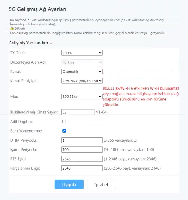 5 GHz Ayarları: Gelişmiş Seçenekler