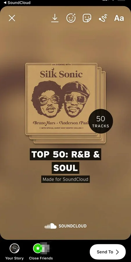 - SoundCloud, Instagram uygulamasını açacak ve şarkının, albümün veya çalma listesinin kapak resmini yeni bir Instagram Hikâyesine otomatik olarak yükleyecektir. Ancak müziğin, kapak resmi üzerinde çalmasını istiyorsanız, yukarıda belirtilen kare gülen yüz simgesini kullanarak müzik eklemeniz gerekir.