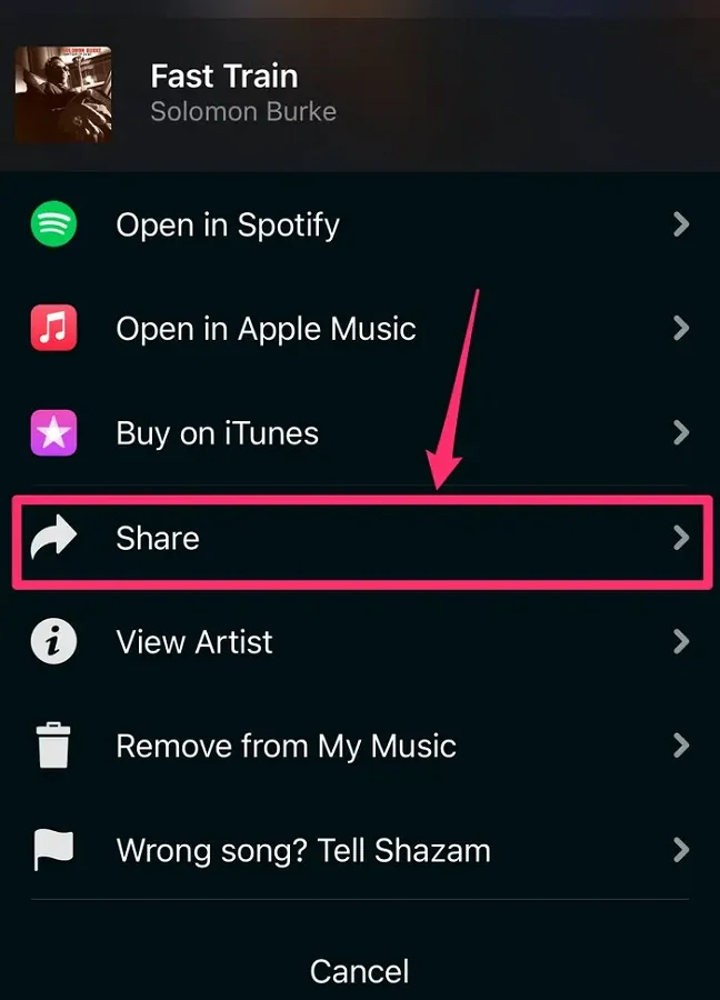 - Yeni bir şarkı belirlemek için Shazam’a Dokun (Tap to Shazam) seçeneğini kullanabilir veya önceki Shazam listenizden bir şarkı seçebilirsiniz. Bir şarkıyı belirledikten sonra, tam ekran olması için şarkıya dokunun.