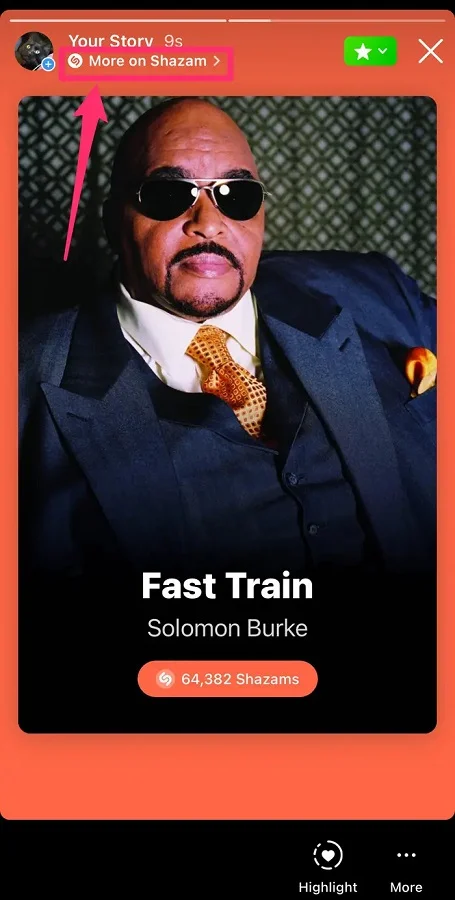 - Hikâyenizi yayınladıktan (paylaştıktan) sonra, Hikâyenin üstünde Shazam hakkında daha fazla bilgi (More on Shazam) yazan bir bağlantı (link) görünecektir. Hikâyenizi görüntüleyen herkes, doğrudan Shazam‘daki o şarkıya gitmek için bu bağlantıya (linke) tıklayabilir.