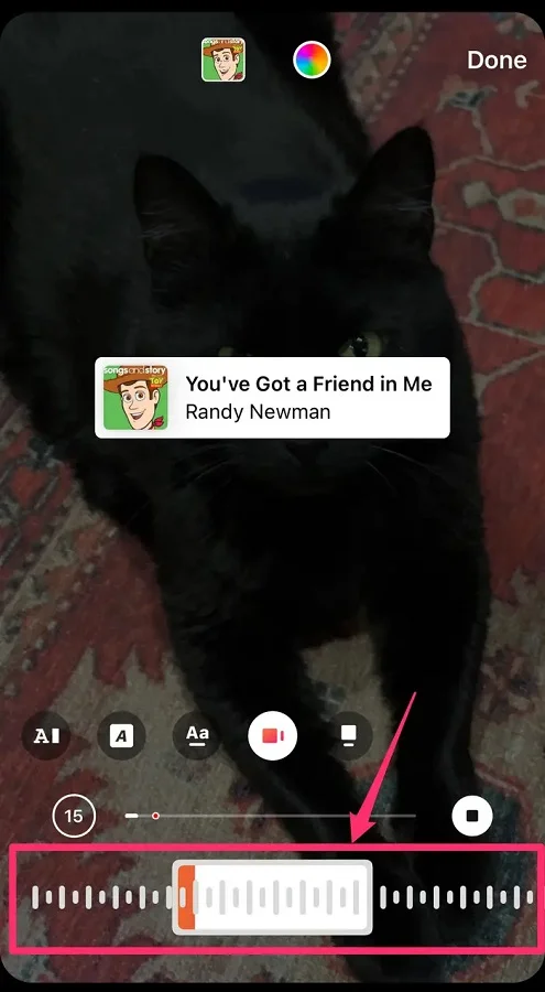 - Bittiğinde, Bitti (Done) menüsüne dokunun. Daha sonra şarkı simgesini farklı bir konuma sürükleyebilir veya simgeyi parmaklarınızla içeri veya dışarı doğru sıkıştırarak büyütebilir veya küçültebilirsiniz. Ardından Hikâyenizi, normalde yaptığınız gibi, yayınlayın.