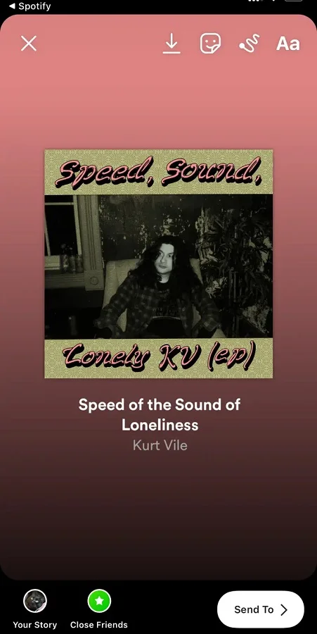 - Spotify, Instagram uygulamasını açacak ve şarkının, albümün veya çalma listesinin kapak resmini, yeni bir Instagram Hikâyesine otomatik olarak yükleyecektir. Ancak, müziğin kapak resmi üzerinde çalmasını istiyorsanız, yukarıdaki adımlarda açıklanan kare gülen yüz simgesini kullanarak müzik eklemeniz gerekir.