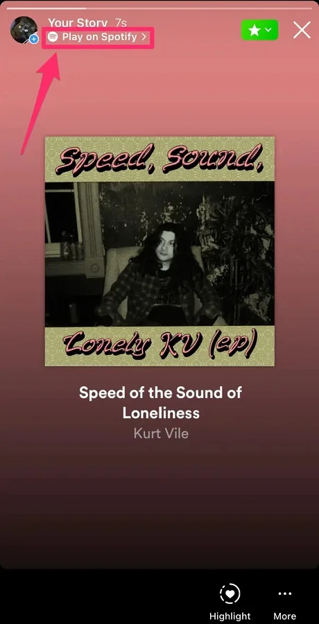 - Hikâyenizi yayınladıktan (paylaştıktan) sonra, Hikâyenin üstünde Spotify’da Çal (Play on Spotify) yazan bir bağlantı görünecektir. Hikâyenizi görüntüleyen herkes, doğrudan Spotify‘daki o şarkıya, albüme veya çalma listesine gitmek için bu bağlantıya tıklayabilir.
