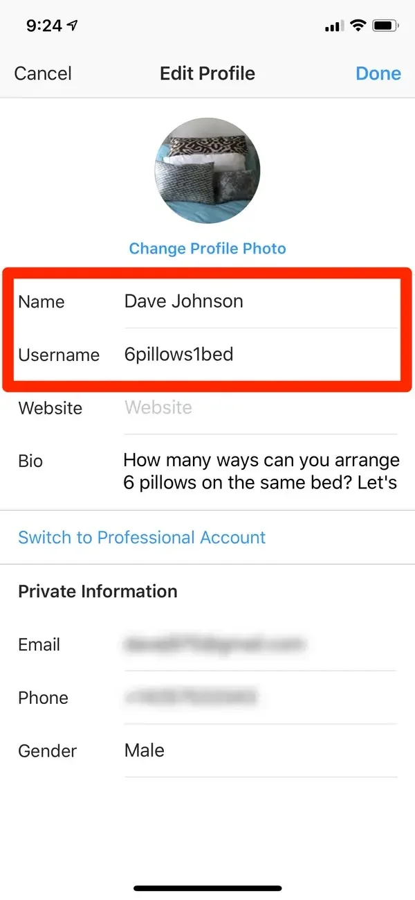 - Profili Düzenle (Edit Profile) sayfasında, Ad (Name) veya Kullanıcı Adı (Username) seçeneklerinin yanındaki alana dokunun ve değişmek istediğiniz adınızı – soyadınızı ve kullanıcı adınızı yazın. Değişikliklerinizi kaydetmek için Bitti (Done) butonuna dokunun.