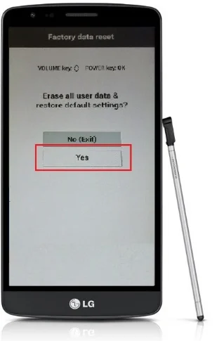 LG logosu görüntülendiğinde, Güç Düğmesinden parmağınızı çekiniz,  Sesi Kısma basılı tutunuz. Ekranınıza fabrika sıfırlama menüsü gelecektir. İşlemi teyit etmek için Sesi Kısma Tuşu ile Yes seçeneğinin üzerine gelerek Güç düğmesine basarak onaylayınız.