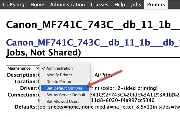 Yazdırıcı detay sayfasında Administration açılır menüsünü bulun. Bu menüden Set Default Options seçeneğini tıklayın.