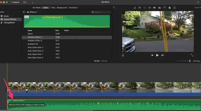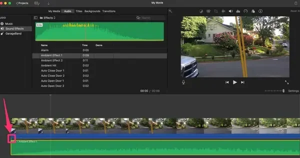 - iMovie projenize eklemek istediğiniz ses efektine ya da müzik parçasına tıklayın ve yüklediğiniz video klibin altındaki iMovie penceresinin altında yer alan düzenleme çubuğuna sürükleyin (ses efektinin ya da müzik parçasının, filmde (videoda), çalmaya başlamasını istediğiniz yere yerleştirin).
