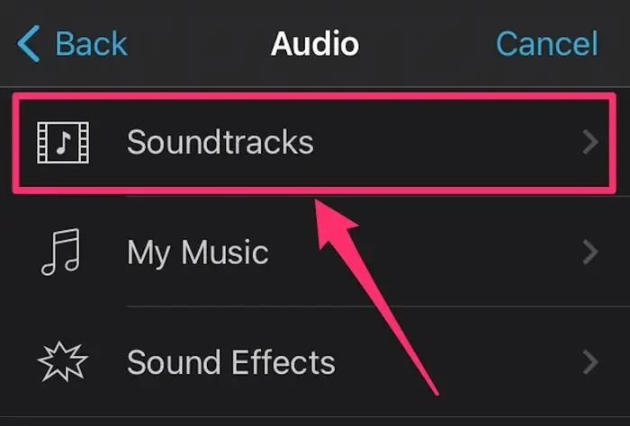 - Film Müziği (Soundtrack) seçeneğine dokunun. Bir film müziğini projeye eklemeden önce dinlemek için film müziği ismine dokunun.