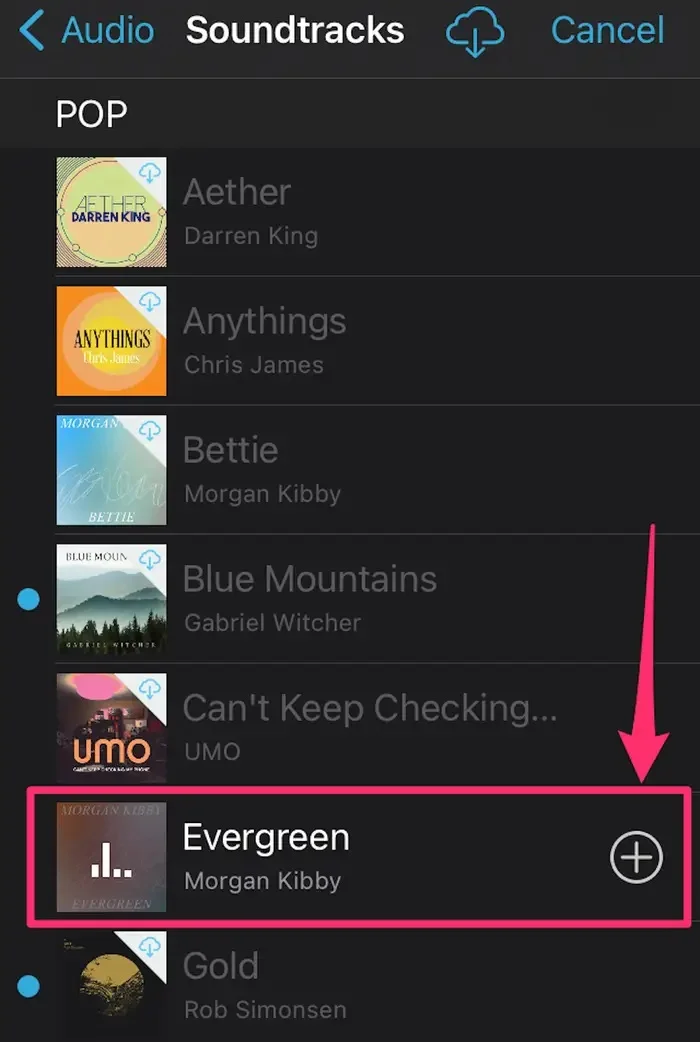 - Hangi film müziğini projenize ekleyeceğinize karar verdikten sonra, film müziği ismine dokunun ve ardından film müziğinin yanındaki + (artı işareti) simgesine dokunun.