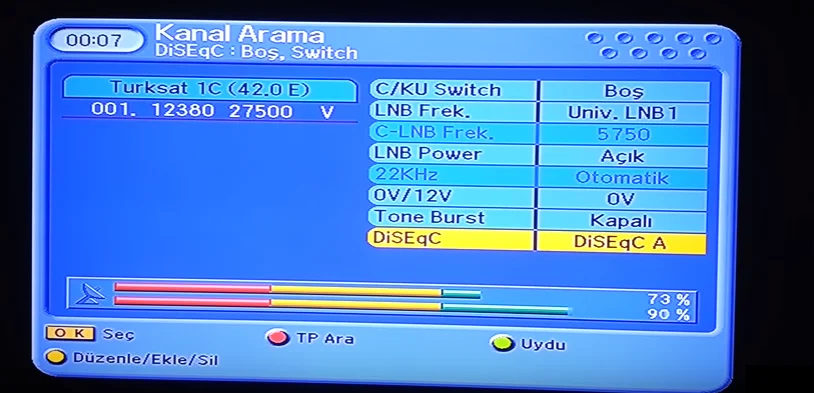 • ‘DiSEqC’ kısmında ‘DiSEqC A’ seçelim. (Apartman, site vb. merkezi uydu sistemi kullanmıyorsanız ‘Boş’ seçelim.)