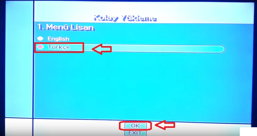 • Cihazınız yeniden başladıktan sonra, açılan ‘Kolay Yükleme’ ekranında ‘Menü Lisan’ ayarını (dili) Türkçe seçelim ve ‘OK’ butonuna tıklayalım.