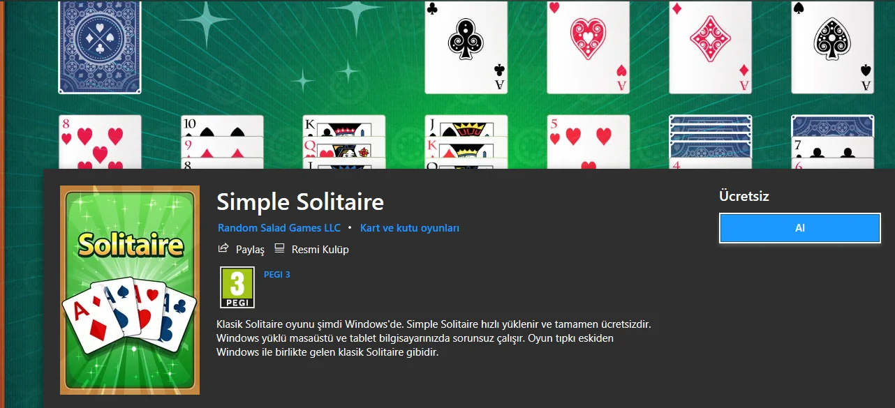 Windows 10 mağazasında ücretsiz olarak bulabileceğiniz bu oyun, diğer oyunlara göre biraz daha detaylı ve gelişmiş özelliklere sahip. Windows üzerinde solitaire oynamak isteyenler için vazgeçilmez bir oyun. İnternetiniz olmasa da rahatça oynayabilirsiniz.
