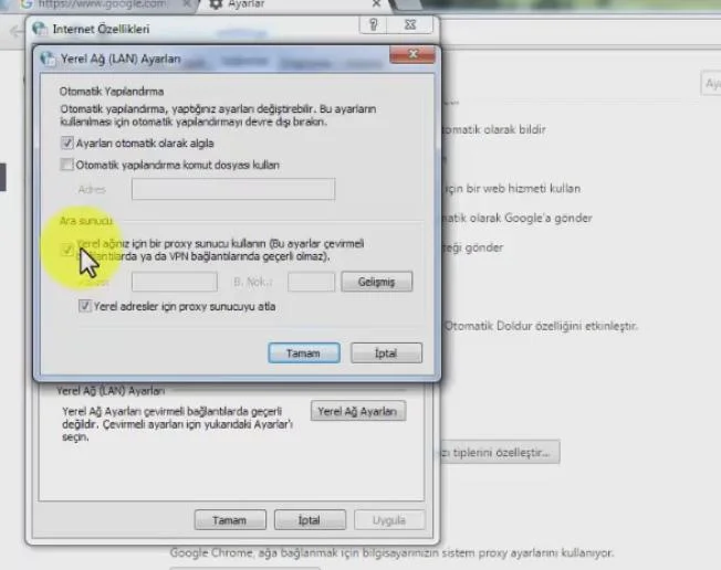 - Bu pencerede açılan sayfada “Yerel ağınız için bir proxy sunucu kullanın (Bu ayarlar çevirmeli bağlantılarda yada VPN bağlantılarında geçerli olmaz)” kısmının solundaki bölüm işaretli olacaktır. O işareti kaldırıp Tamam diyerek sekmeleri kapatalım.