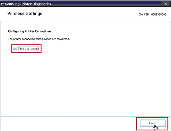 Print a test page kutusunu işaretleyerek Finish butonuna tıklayın. Print a test page bir test sayfası yazdır anlamına gelir. Kısa süre içerisinde yazıcınız marka modeline ait bilgiler içeren bir sayfa yazdıracaktır. Çıktıyı sağlıklı bir şekilde alabildiyseniz yazıcınızın kablosuz yapılandırması sorunsuz şekilde tamamlanmıştır.