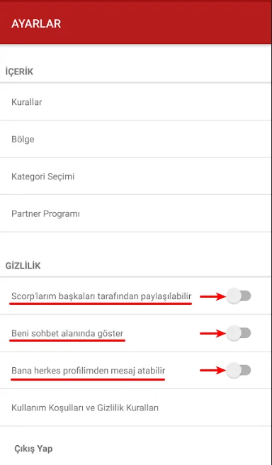 - Farklı kişiler tarafından Scorp’larınızın paylaşılmasını istemiyorsanız, sohbet alanında görülmek istemiyorsanız ve size mesaj atılmasını istemiyorsanız, “Scorp’larım başkaları tarafından paylaşılabilir”, “Beni sohbet alanında göster”, “Bana herkes profilimden mesaj atabilir” seçeneklerini pasif hale getirmelisiniz.