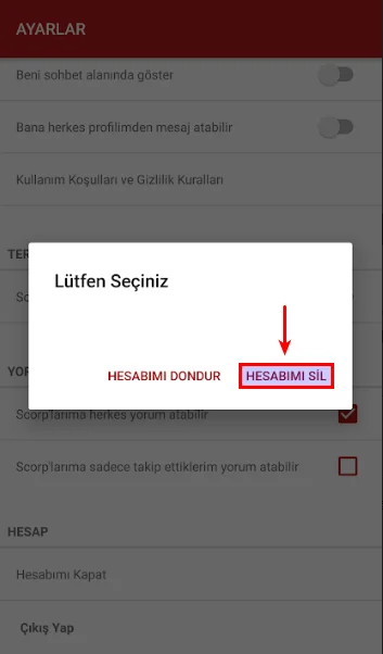 - Açılan AYARLAR penceresinde Hesabımı Kapat seçeneğine tıklayınız.
