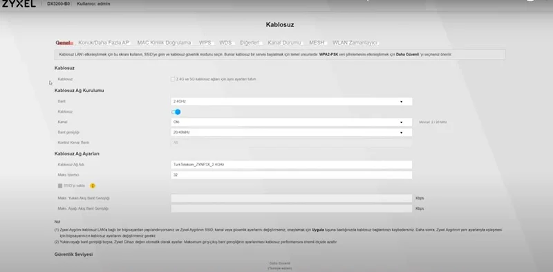 Şimdi, Türk Telekom Zyxel DX3200-B0 kablosuz şifre değişikliği işlemine geçelim: