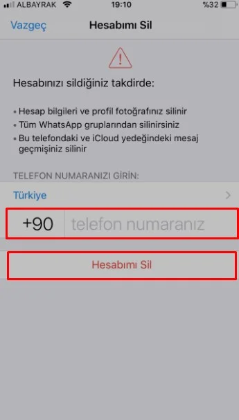 - Son işlem olarak açılan sayfada silmek istediğiniz kayıtlı WhatsApp numaranızı yazmanız ve alt tarafındaki ‘Hesabımı Sil’ kısmına tıklamanız yeterli olacaktır.