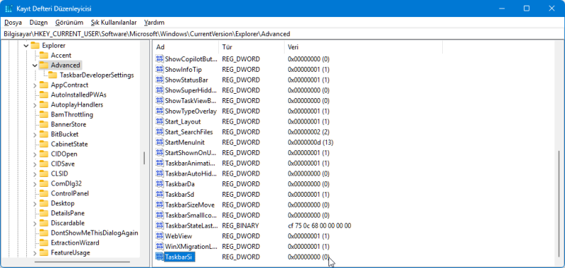 TaskbarSi değerini 1 (varsayılan) olarak ayarlayın.