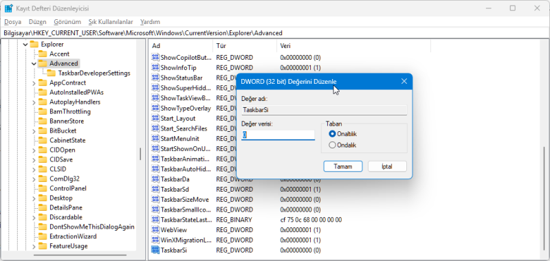 (görev çubuğu boyutu küçültme)1 = değeri görev çubuğunu varsayılan boyuta getirir. Eğer değişikliklerden memnun değilseniz, bu değeri kullanarak eski haline getirebilirsiniz. (varsayılan)