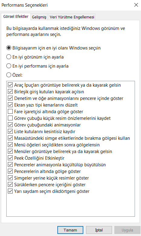 - Windows arama kısmına, Gelişmiş Sistem Ayarlarını Görüntüle yazın. Açılan pencerede Performans bölümünün altında Ayarlar butonuna tıklayın.