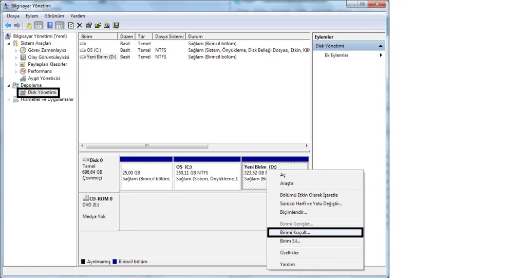 Bölmek istediğimiz diskin üzerine sağ tıklıyoruz birimi küçült diyoruz.